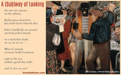 As I was thinking about what to write, it seemed to me that the subway hasn't changed all that much. If anything, we are MORE isolating than ever, what with all our devices and earbuds, etc. Here's where I landed: