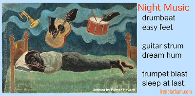 Today's piece is called Untitled by Palmer Hayden. I was drawn to this piece instantly -- maybe because I DO dream of music. :) However, I feel like "dreaming of music" os a bit of a cliche... so I wanted to do something different. Often when I am fighting a cliche, I find that "less is more." (Which IS a cliche! Ha!) And that's exactly how I was able to move forward -- by thinking short and punchy. I don't know... this was the best I could do with the time I allot each morning for this process! I DO like the unexpectedness of the trumpet blast being the sound that put this man to "sleep at last."