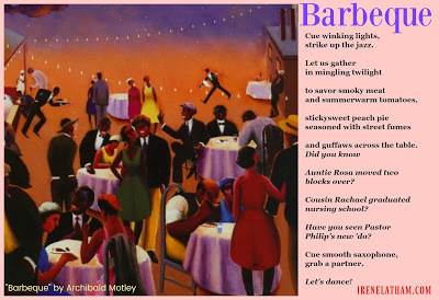 Today I'm continuing my Harlem Renaissance poetry project with a first look at artist John Archibald Motley, Jr -- who went by "Archibald Motley." He was popular in the early days of the Harlem Renaissance (1920's) and is called a "modernist." Many of his pieces feature lively music and dancing scenes. I've selected two of them to write on for this project. One of the things I learned about Motley is that he grew up in a white neighborhood in Chicago, and that often there is a sense of humor or irony in his paintings. The perspective he uses is that of observer or outsider-looking-in (which I think all of us can relate to at one time in our lives or another!). And he shows African American people with a wide variety of skin tones and physical characteristics, which helped bucked the stereotypes.The first painting I want to share is "Barbeque." This one makes me think of a poem I often share with kids called "Knoxville, Tennessee" by Nikki Giovanni. I decided my goal would be to create a poem that engages all the senses, as Giovanni's poem does.