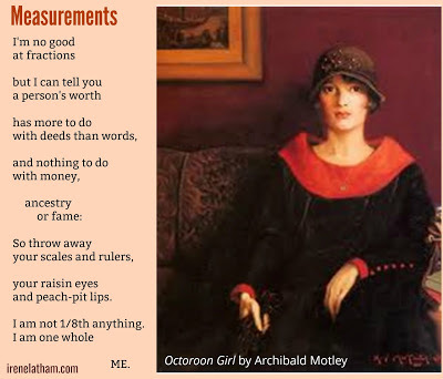 <!-- @page { margin: 0.79in } P { margin-bottom: 0.08in } </style> </div>--> <br /><div style="margin-bottom: 0in;"><b>Measurements (for an Octoroon Girl)</b></div><div style="margin-bottom: 0in;"><br /></div><div style="margin-bottom: 0in;">I'm no good</div><div style="margin-bottom: 0in;">at fractions</div><div style="margin-bottom: 0in;"><br /></div><div style="margin-bottom: 0in;">but I can tell you</div><div style="margin-bottom: 0in;">a person's worth</div><div style="margin-bottom: 0in;"><br /></div><div style="margin-bottom: 0in;">has more to do </div><div style="margin-bottom: 0in;">with deeds than words,</div><div style="margin-bottom: 0in;"><br /></div><div style="margin-bottom: 0in;">and nothing to do</div><div style="margin-bottom: 0in;">with money, </div><div style="margin-bottom: 0in;"><br /></div><div style="margin-bottom: 0in;"> ancestry </div><div style="margin-bottom: 0in;"> or fame:</div><div style="margin-bottom: 0in;"><br /></div><div style="margin-bottom: 0in;">So throw away</div><div style="margin-bottom: 0in;">your scales and rulers,</div><div style="margin-bottom: 0in;"><br /></div><div style="margin-bottom: 0in;">your raisin eyes</div><div style="margin-bottom: 0in;">and peach-pit lips.</div><div style="margin-bottom: 0in;"><br /></div><div style="margin-bottom: 0in;">I am not 1/8<sup>th </sup>anything.</div><div style="margin-bottom: 0in;">I am one whole</div><div style="margin-bottom: 0in;"><br /></div><div style="margin-bottom: 0in;"> ME.</div><div style="margin-bottom: 0in;"><br /></div><div style="margin-bottom: 0in;"><i>- Irene Latham</i></div><div style="margin-bottom: 0in;"><br /></div><iframe allow="autoplay" frameborder="no" height="166" scrolling="no" src="https://w.soundcloud.com/player/?url=..." width="100%"></iframe>