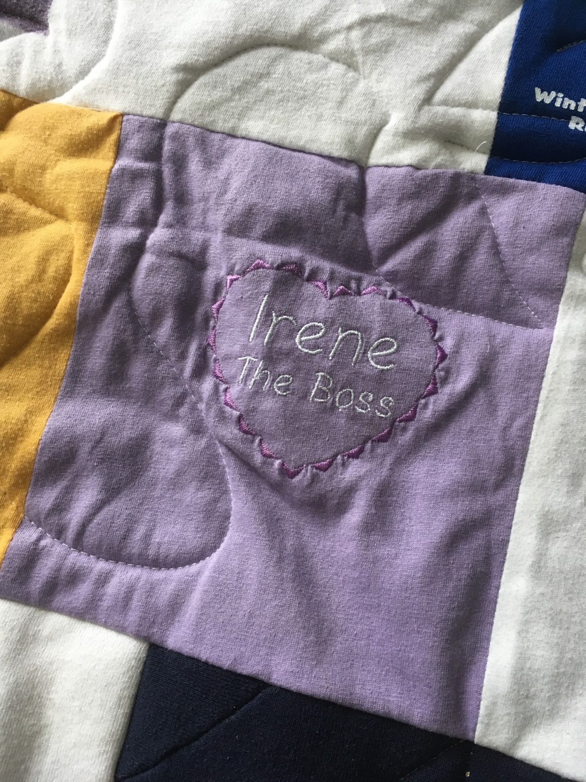 Irene "The Boss" t-shirtin its current life as a quiltThe women in my family dubbed me The Boss. (My mom even made me a t-shirt once with "The Boss" monogrammed on the pocket.) I'm generally the organizer and instigator. I get things done! And I *might* have been a bit of a bossy big sister... I do have memories of playing house with my sister Lynn and insisting that she be the father, because of course I HAD to be the mother. Lucky for me Lynn was always pretty flexible and agreeable. (Still is.)