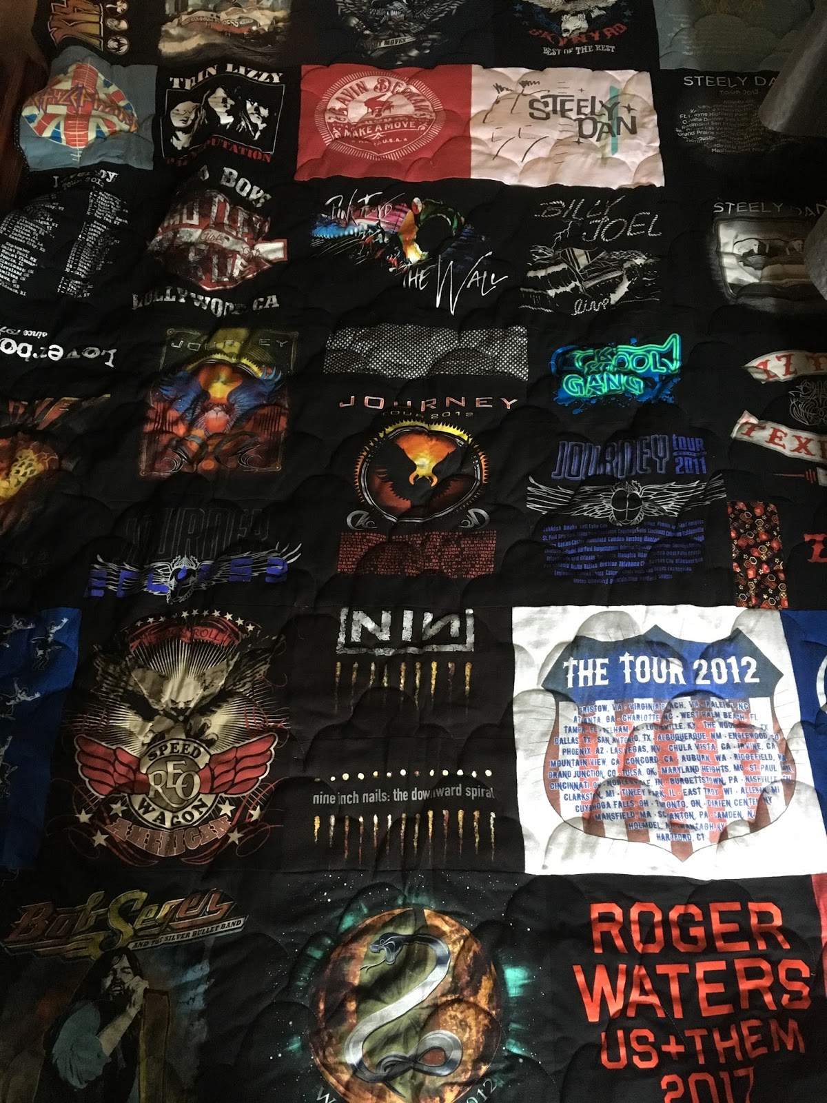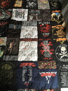 ....finally, here is a double-sided t-shirt quilt I've just made for our youngest son as a graduation gift (shh!). It includes t-shirts from all the concerts he's been to with his dad. :)