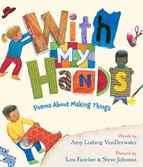 And now, I've got to share with you about WITH MY HANDS: Poems about Making Things by Amy Ludwig VanDerwater, picutres by Lou Fancher & Steve Johnson, brought to us by Clarion Books. Amy is a maker, a do-er, so this book is like sharing an afternoon in Amy-land! I love it. Maybe because I am a maker and a do-er, too... my whole life I've been painting and doodling and stained-glassing and scrapbooking and collaging and quilting and stitching and baking and crafting. And there are poems in this book for many of these things! I'd like to share 2 of my favorites: