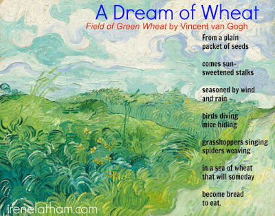 This past weekend in between fishing and eating and sorting through some old letters, I read from cover to cover Amy Ludwig VanDerwater's newest book for teachers: POEMS ARE TEACHERS: How Studying Poetry Strengthens Writing in All Genres (Heinemann, 2017).As an occasional teacher -- and as a visiting author who talks with teachers who are eager for help teaching poetry -- I am always looking for new ideas and resources. This book is IT. Not only are these pages bursting with Amy's trademark warmth and wisdom (who doesn't love Amy?!), the book also includes some great poems by students and by poets who write for children. I'm honored to have one of my ArtSpeak! Plant, Grow, Eat (2016) poems included in the chapter about writing poems after art: "A Dream of Wheat."