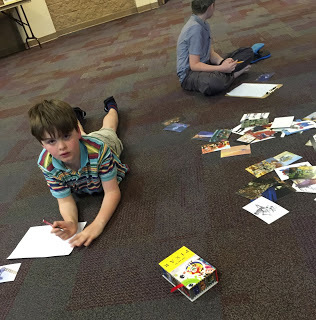 First I gave them a handout with my tips for writing/publishing for kids. (If YOU want the handout, I am happy to share it! Simply email me: irene (at) irenelatham (dot) com.) Here are the young writers (and moms) selecting postcards: