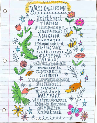 "Word Collection"from READ! READ! READ!The Delicious: I love poring over Ryan’s joyous and whimsical art, remembering the people and moments and stories that inspired each poem. The words Cinderella and mozzarella, in “Word Collection” for example, have long sat in my notebook, just jottings from a normal day. I smile to remember that long-ago evening when our toddler Hope (now an adult) called out at dinner, “I have a rhyme! Cinderella! Mozzarella!” I find it magical that a moment from years ago can live on between the covers of a book.