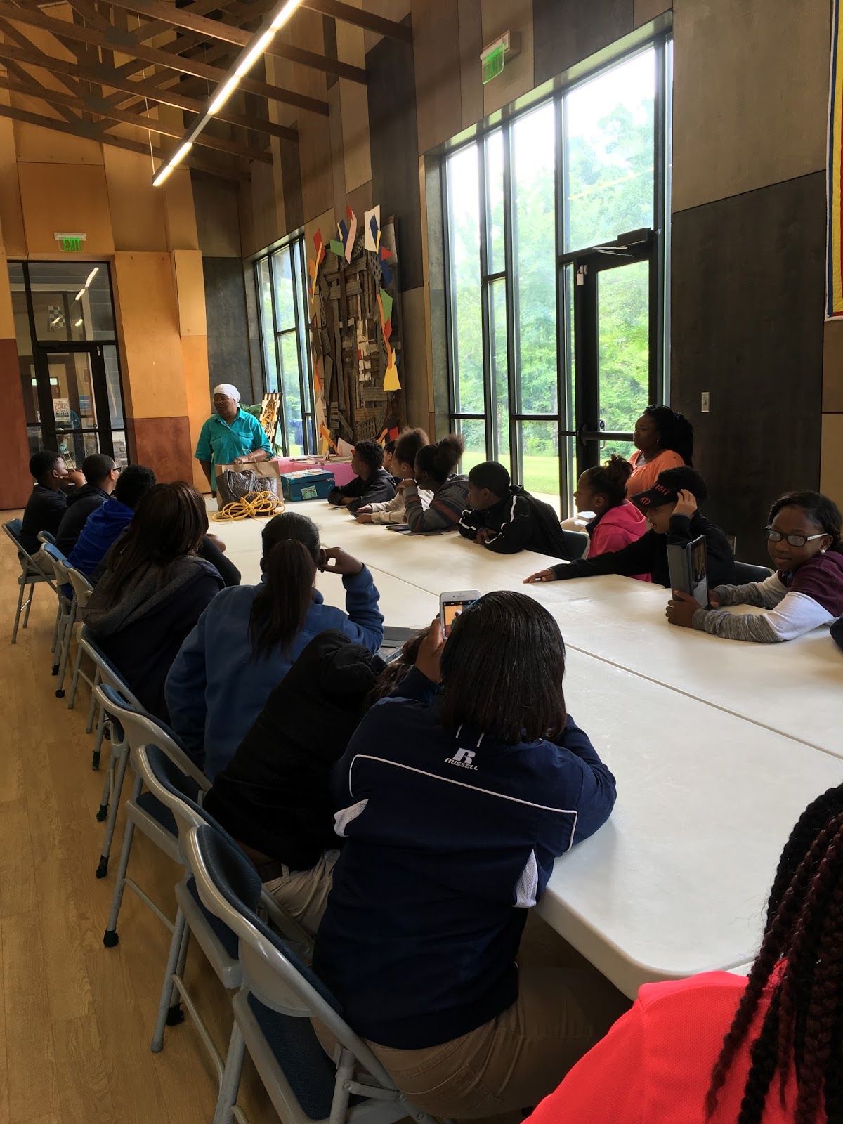 ... and then it was back to the ferry terminal to meet the kids. Oh, what a wonderful group! The acoustics aren't all that great in that room, and we had no microphone, and we were missing cables for the powerpoint, so.... we winged it in true Gee's Bend style! One thing that was super fun was that all the kids had ipads donated by Apple, and they were charged with telling a story about their day. I loved meeting the Apple folks and seeing all those kids using technology to share stories. I have been promised links to their projects very soon!