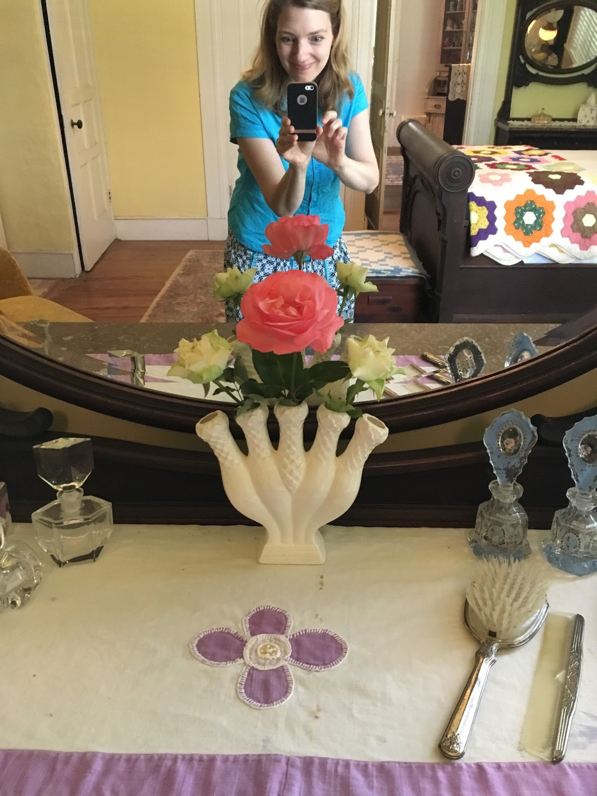 Ludelphia and I felt right at home in these rooms. And I am so grateful to the folks who stopped by and picked up copies of our book! I especially enjoyed meeting a couple who hails from Camden, as we were able to talk about mutual friends and acquaintances. Fun!And Easty and Avery seem to be settling in well to this new adventure... there was even a quilt on the wall, which I loved! Oh, and a special guest in the bathroom... who some might call "the King." Do you know who I'm talking about? Go to the store and see if you're right. :)