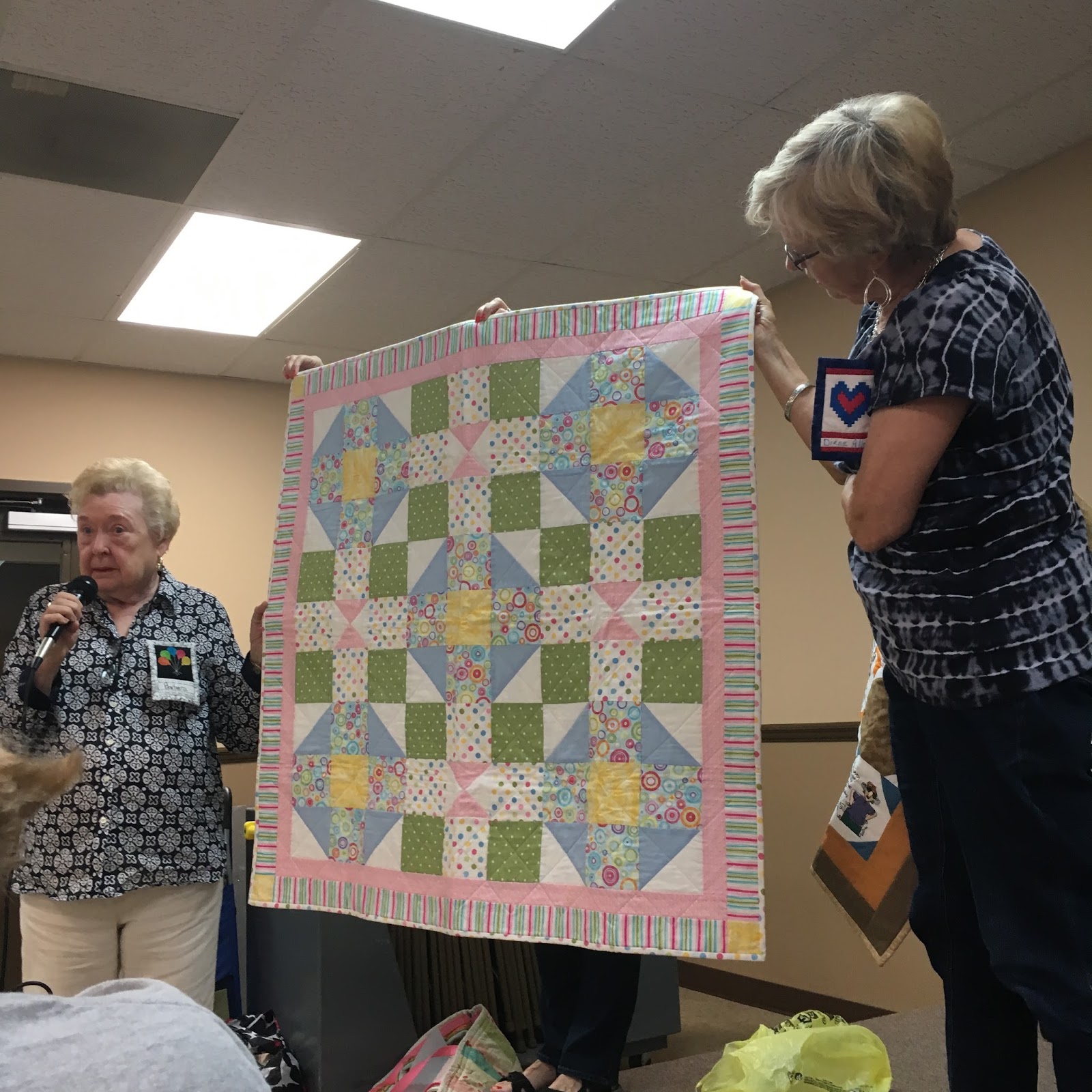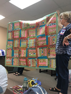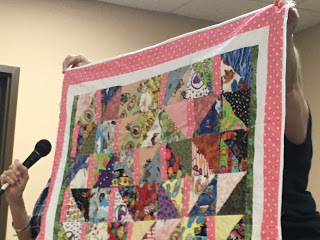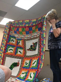 Eric Carle book quilt!Listening to the women, I was struck by a few things: 1. how many of these quilts were made as gifts for others, and 2. how talented these quilters are, and 3. quilts really do tell a story! One of my favorites was a mom who quilted a top created by her daughter. She said it was intended to be a Rail Fence design, but after her daughter had her way, it was a "crooked" Rail Fence. Oh boy, can I relate to that! Pretty much all my quilts are crooked. That's what makes them beautiful and unique!