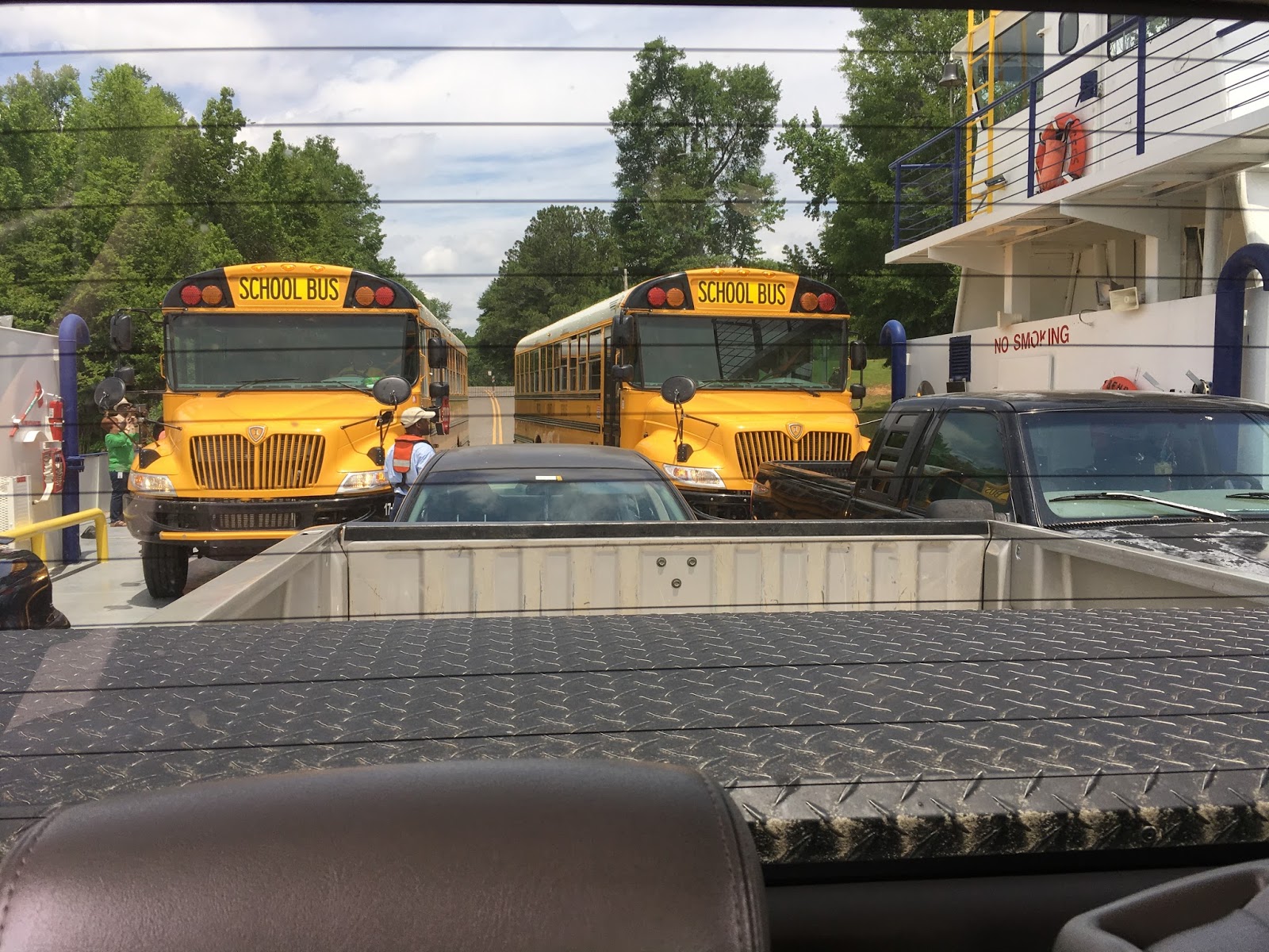 ... and then it was time to leave Gee's Bend. We got on the ferry, and guess what else got on the ferry, despite insurance concerns? Two schoolbuses full of kids! This was a pretty big deal, and I was glad to be there to witness it. Thankfully, there were no mishaps. Next we headed back to Camden for a quick bite to eat at Larry's (the day's special was spaghetti and