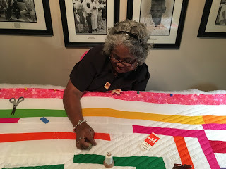 While we waited for the students to arrive (due to insurance reasons, the kids were not allowed to ride over on the ferry and had to take the long 40-mile route by road), Sulynn and I hopped down the road to the Collective, so I could say hello to Mary Ann Pettway. She was already working away... later I heard she told the kids about the tape she keeps on her fingers, because yes, if you quilt, you're going to get poked! Here she is hard at work: