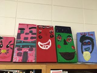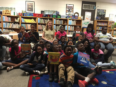 art by students atop bookshelves in libraryThe final school I visited was Salem Elementary in Orrville, Alabama -- not in Wilcox, but Dallas County. In many ways it felt every bit as isolated as Gee's Bend, and I was reminded of how the Black Belt stretches on and on, so many trees and woods and narrow roads and no cell service. :) There I was met by a wonderful teaching-artist Jo Taylor and an enthusiastic artsy librarian Karen Grimes ... and a bunch of bright-eyed kids!