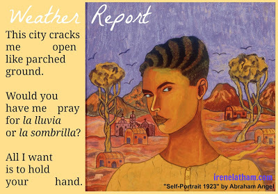 All I wantis to hold your hand. <!-- @page { margin: 0.79in } P { margin-bottom: 0.08in } </style> </div>--> <div style="margin-bottom: 0in;"><br /></div><div style="margin-bottom: 0in;">- Irene Latham</div><div style="margin-bottom: 0in;"><iframe frameborder="no" height="450" scrolling="no" src="https://w.soundcloud.com/player/?url=..." width="100%"></iframe>------------------------</div><div style="margin-bottom: 0in;">This is the second time this month I've used weather as a theme! Poem #9 is titled <a href="http://irenelatham.blogspot.com/2017/... of the Weather."</a></div><div style="margin-bottom: 0in;"><br /></div><div style="margin-bottom: 0in;">As with my Frida Kahlo-inspired poem <a href="http://irenelatham.blogspot.com/2017/..., Sitting for a Portrait"</a> from earlier in the month, I wanted to be sure and incorporate some Spanish words. Again, I leaned on Google. And I had a little lesson in what translators must go through: there were two choices for umbrella: <i>el paraguas</i> and <i>la sombrilla</i>. I chose <i>la sombrilla</i> because it sounded better with <i>la lluvia</i> (which means "rain.") </div><div style="margin-bottom: 0in;"><br /></div><div style="margin-bottom: 0in;">So much of poetry is about sound! Which is part of what makes recording these poems on SoundCloud as much a learning experience as anything. I find that I often make revisions after I hear myself stumble or stutter or, often, say a completely different word!</div><div style="margin-bottom: 0in;"><br /></div><div style="margin-bottom: 0in;">Anyhow, I chose not to incorporate the English meaning into the poem. I'm hoping there are enough other clues to make the poem comprehensible without an in-poem translation. What do YOU think?</div><span style="font-family: "times";"><br /></span>