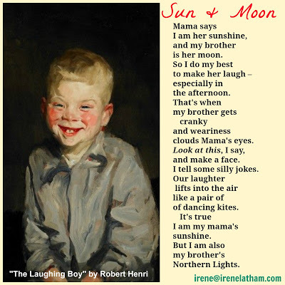 Mama says I am her sunshine,and my brother is her moon.So I do my best to make her laugh –especially in the afternoon.That's when my brother gets crankyand weariness clouds Mama's eyes. Look at this , I say, and make a face.I tell some silly jokes. Our laughter lifts into the airlike a pair of of dancing kites. It's trueI am my mama'ssunshine.But I am also my brother's Northern Lights.