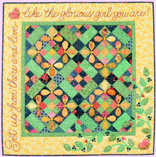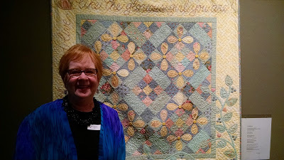 Mimi & her quilt (and my poem)Today I'm delighted to share with you another happy National Poetry Month event. Thank you, Laura Shovan, for sharing with me about the Blossoms of Hope exhibit at the Columbia Art Center, which displayed, during the month of April, artworks and poems inspired by them.I selected a quilt, of course! "Glorious Girl" by Mimi Deitrich (pictured above). Not only do I love the colors in the quilt, the quilting, but it also contains a line from THE SECRET LIFE OF BEES. I knew instantly that's what I wanted to write about! (Thank you, Laura, for sharing the pictures from the opening reception with me!) And here is my poem: