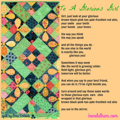 "Glorious Girl" by Mimi DeitrichHello and Happy Poetry Friday! Be sure and visit beautiful Tara at A Teaching Life for Roundup!Once again, this Friday has me traveling. But it's all good -- I am talking about many of the things I love: books and quilts and writing and history and family... I'm grateful to be invited to share these things with groups of all ages.