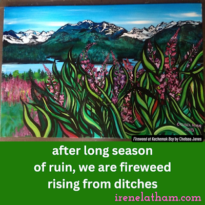 Fireweed is quintessential Alaska. It grows everywhere and for the whole summer season (June to September). Turns out it got its name because it's the first thing to pop up after fire...which makes it a resilient and arresting flower...and a SURVIVOR! Of course I wanted to write about it!