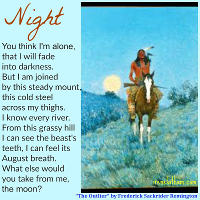 - Irene Latham--------------------- Readers, I waffled on the title of this one. I couldn't decided between "The Outlier" or "Night." I ultimately chose "Night" because I think it adds another layer of meaning to the poem. Plus, Sunday's poem was titled "Morning." :) For more information about the artwork, click through to the Brooklyn Museum, where this painting is on view.