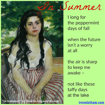 - Irene Latham <!-- @page { margin: 0.79in } P { margin-bottom: 0.08in } </style> </span><br /><br /><div style="margin-bottom: 0in;"><iframe frameborder="no" height="166" scrolling="no" src="https://w.soundcloud.com/player/?url=..." width="100%"></iframe>----------</div><div style="margin-bottom: 0in;">Okay, so, yes, a little bit of me in this poem! I am not a huge fan of summer's heat and bugs and sun and exhaustion... and doesn't Lise look weary here? I think my niece who so greatly resembles Lise would also agree. :) And isn't it in those lazy times that our minds turn to worries? In fall, who has time for such leisures? At least that's MY experience. Thanks so much for reading!</div>