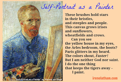 Today's portrait is a self-portrait by Vincent van Gogh. I'm sort of fascinated by van Gogh, so I enjoyed doing a little research before writing this poem. I especially enjoyed this article about 7 Things You May Not Know about van Gogh. Also, I am loving the beautiful book VINCENT'S STARRY NIGHT AND OTHER STORIES: A Children's History of Art by Michael Bird, illus. by Kate Evans. I love it so much, I bought myself a copy. I could live inside this book!