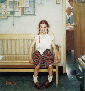 Readers, do you recognize the "tune" of this poem? Yes, I simply modeled the rhythm of "Row Your Boat." I actually wrote another verse, too, but in the end decided for this little girl, less is most definitely more! One thing that interests me about the painting is the swatches of red -- across her cheek, her lips, her clothing... it almost looks clown-ish?? I think the general broadness of the strokes is the main thing that makes me see this little girl as one who would much prefer to be outdoors. Plus she reminds me of Girl with Black Eye by Norman Rockwell!