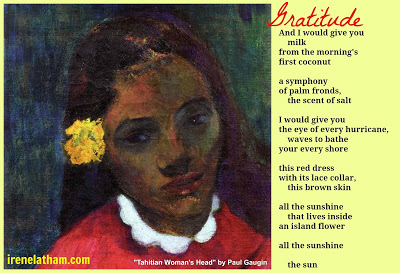Today I have "Tahitian Woman's Head" by Paul Gaugin. I love the sweetness of this woman's expression, and of course the flower in her hair. Here's what she told me: