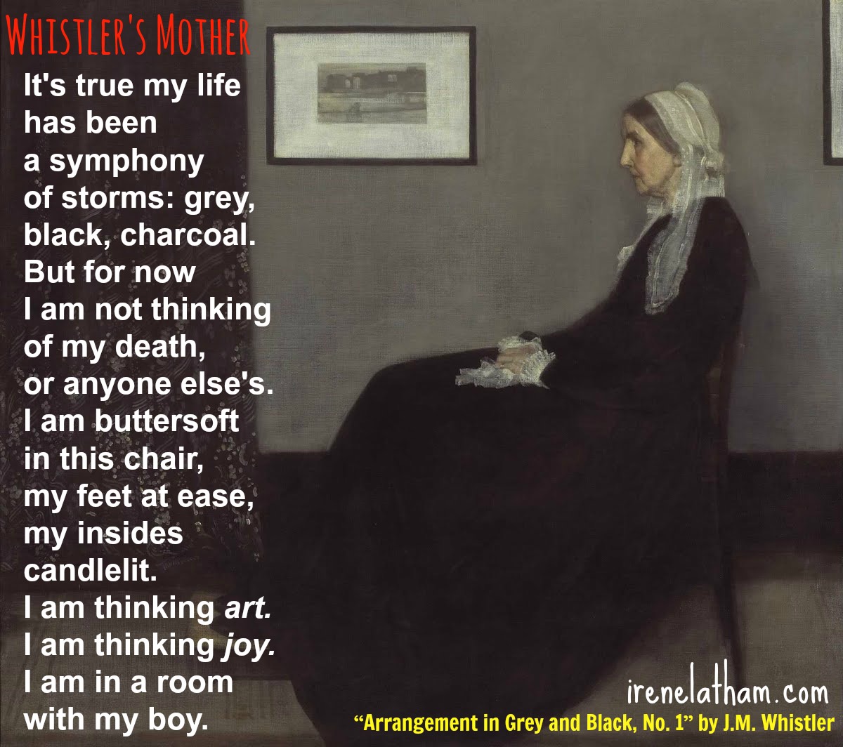 Whistler's Mother- after “Arrangement in Grey and Black, No. 1” by J.M. WhistlerIt's true my lifehas beena symphonyof storms: grey,black, charcoal. But for nowI am not thinkingof my death,or anyone else's.I am buttersoftin this chair,my feet at ease,my insidescandlelit.I am thinking art.I am thinking joy.I am in a roomwith my boy.