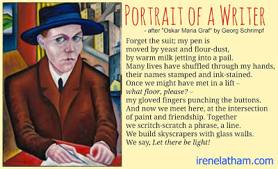 - Irene Latham----------------Readers, I didn't know the subject of this painting Oskar Maria Graf was a writer -- or that he and the painter George Schimpf were friends -- until I read this article. I've incorporated bits of Oskar's life into the poem, too -- he was born to a baker-father and farmgirl-mother, and before he was a writer worked as a postal worker and lift operator. I wanted to include these specific details, but I also wanted to write a poem about the universal aspects of being a writer... which is how I came up with the God-like last line. We are all creators, right? :) Thank you for reading! And for your encouragement. It helps! xo