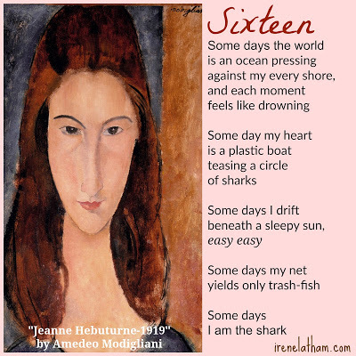 Readers, Jeanne is rather a tragic figure. An artist in her own right, she married Modigliani at a young age. Shortly after her husband died -- when she was only 22 -- she committed suicide. You can find out more about Jeanne here. Jeanne was actually 21 when she sat for this portrait. But to me, she looks so young -- and, knowing what was to happen to her, I couldn't help but imagine her as a teen. There's a softness and innocence in her face, but also an almost-menacing resolve. She seems to me caught in the inbetweenland of power and powerlessness. She seems sixteen. And so, for me, for this poem, she is! Thanks so much for reading!