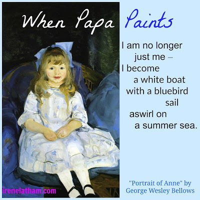 I am no longer just me –I become a white boat with a bluebird sail <!-- @page { margin: 0.79in } P { margin-bottom: 0.08in } </style> </div></div>--> <br /><div style="margin-bottom: 0in;"> aswirl on </div><div style="margin-bottom: 0in;"> a summer sea.</div><div><i><br /></i></div><div><i>- Irene Latham</i></div><div>--------------------</div><iframe frameborder="no" height="166" scrolling="no" src="https://w.soundcloud.com/player/?url=..." width="100%"></iframe> <div>Readers, I struggled with this poem! Anne was George Wesley Bellows' eldest daughter. When I did a little <a href="http://www.high.org/Art/Permanent-Col..., I found out that he would pay his children 25 cents an hour to sit for him. So I tried writing a poem that was a list of the things Anne wanted to buy with her quarter -- which meant doing some research into 1915 toy and candy prices. But I just couldn't make it work. I stepped away from it and came back with my imaginative eye, and that's how I landed where I landed. Thanks so much for reading!</div>