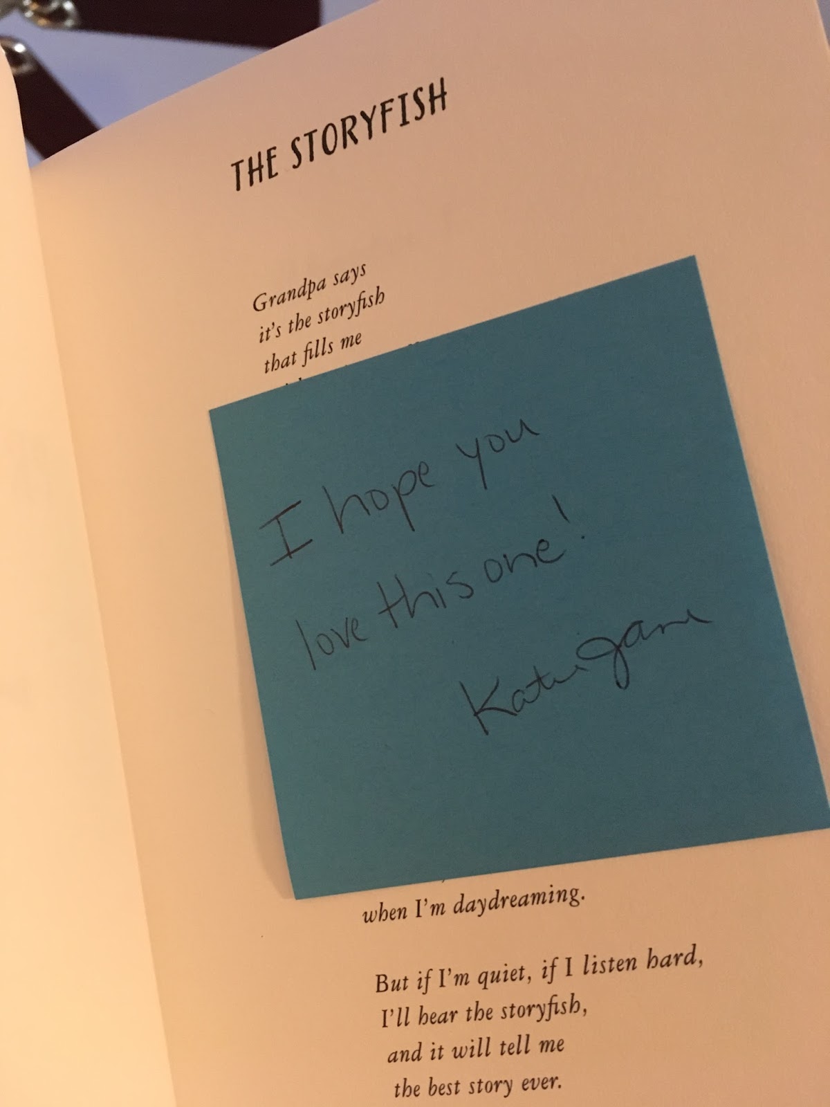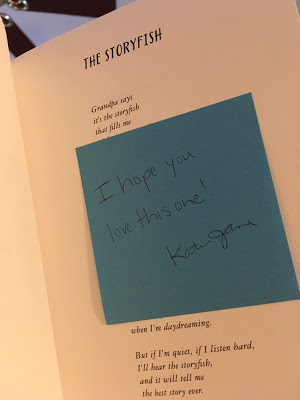 About a week ago I attended a Championship Tailgate event... at my library! It's an annual event hosted by Katie Jane Morris of Hoover Library in which she speed-book-talks her favorite titles from the previous year.I immediately put on request about twenty titles I hadn't already read, and also shared with Katie Jane some additional titles that made my list. And then yesterday, when I opened one of the books, CATCHING A STORYFISH by Janice N. Harrington (WordSong, 2016), this is what I found:
