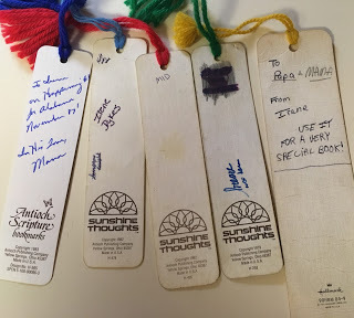 I found so many of my favorite things: handmade bookmarks! bookmarks with quotes! Animal bookmarks! Bookmarks from places I've traveled (Cherokee, NC)! And some of them had writing on the back: