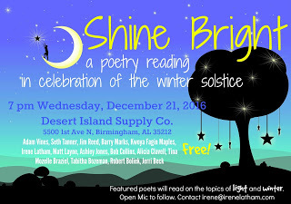 Tonight's the night! Birmingham friends, I hope you'll join me for SHINE BRIGHT, a poetry reading and open mic in celebration of the winter solstice.Here is the poem I will be reading: