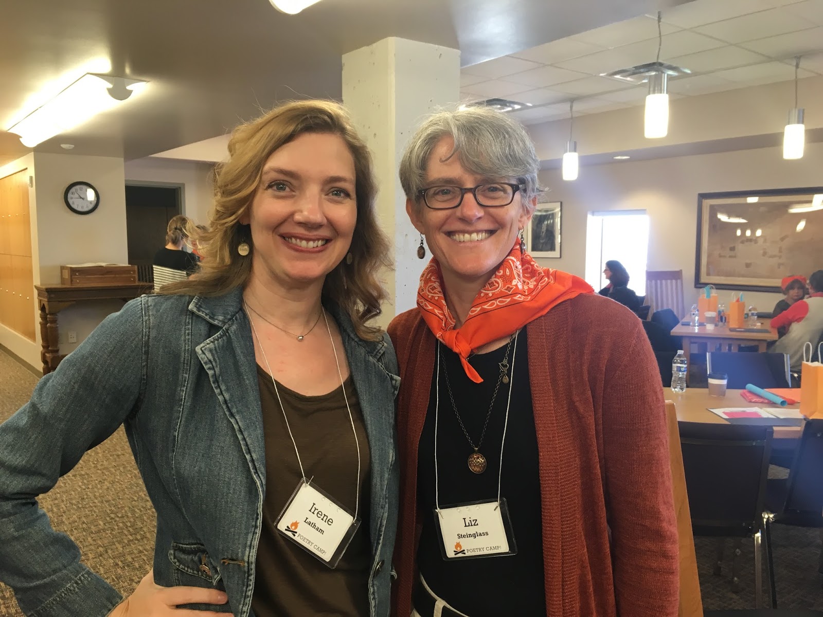 me & LizAnd to Liz Steinglass who was the best session partner never. (Want a copy of our handout on Metaphor & Simile? Email me: irene (at) irenelatham (dot) com.) And to Carol-Ann Hoyte and Cynthia Grady and Michelle Schaub, who has a farmers' market poetry book coming next year! And to Nancy Bo Flood and Carmen T Bernier-Grand and to everyone everyone... yes, it was THAT kind of camp. :)There came a point on Saturday when I had reached my limit -- I'm an introvert, and I wasn't feeling well, and I had been traveling all week... and thank God for Ramona who said, yes, I can take you back to Seattle. Yes, I will get you to your already-payed-for airport hotel. Yes, we can stop at the drugstore. And hey, have you ever tried Starbucks' SHORT (who knew then even had a "SHORT?") caramel apple cider? Well, I have now! Thank you again and again, Ramona! Mwah!
