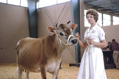Hello, and Happy Poetry Friday! Be sure to visit Tricia at Miss Rumphius Effect for Roundup.I've just finished MOO by Sharon Creech. I thought of my mother the entire time I was reading it -- because my mom was once a big-time prize-winning 4-H girl who, in addition to competing in the areas of sewing and public speaking, showed dairy and beef cows. Her favorite was a Jersey cow named Penny, who won her a GRAND CHAMPION prize. Here's a picture: