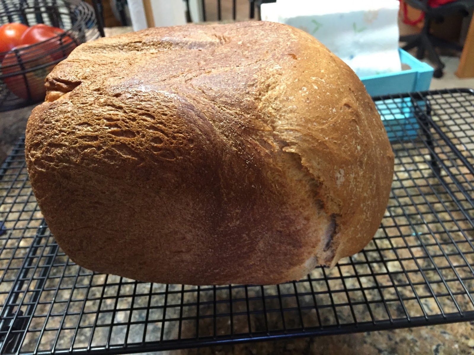 honey wheat loaf, fresh from the machineThis morning our house smells deliciously of yeast.