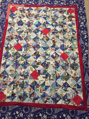 5. My blue Christmas quilt is coming along! Here's the top. (At the last minute I thought to add the red pieces... I really love the contrast!)