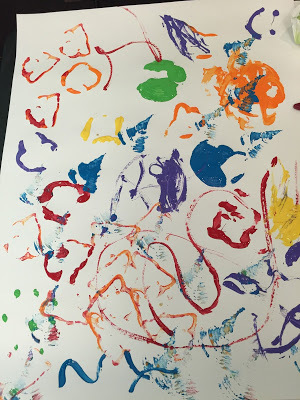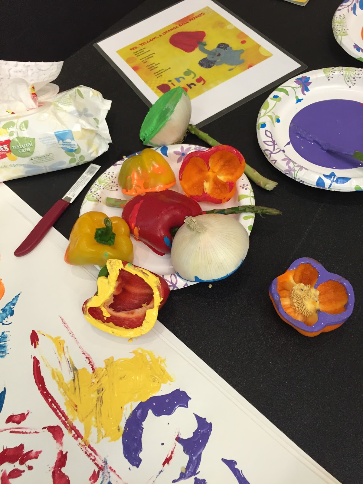 We painted with asparagus paintbrushes and stamped with cut pieces of onion and bell pepper.