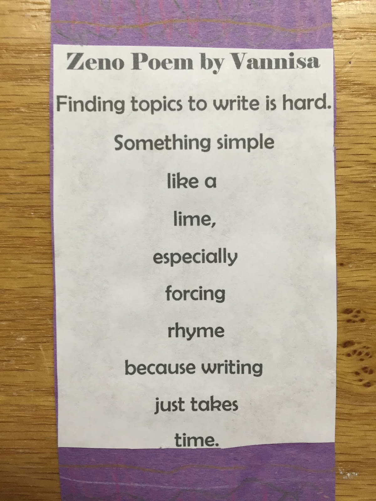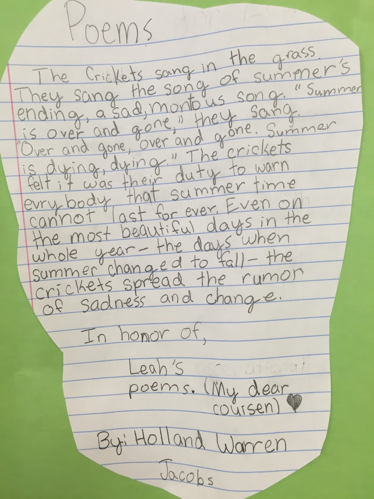 I was also greeted by a bulletin board of student poems -- poems about birthdays and birds and hermit crabs and melons and whales and crickets... lots of great writing going on at Vestavia Central!