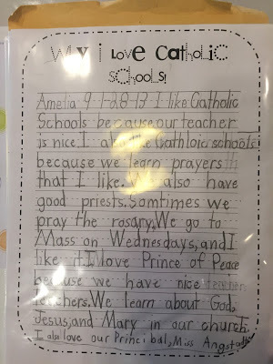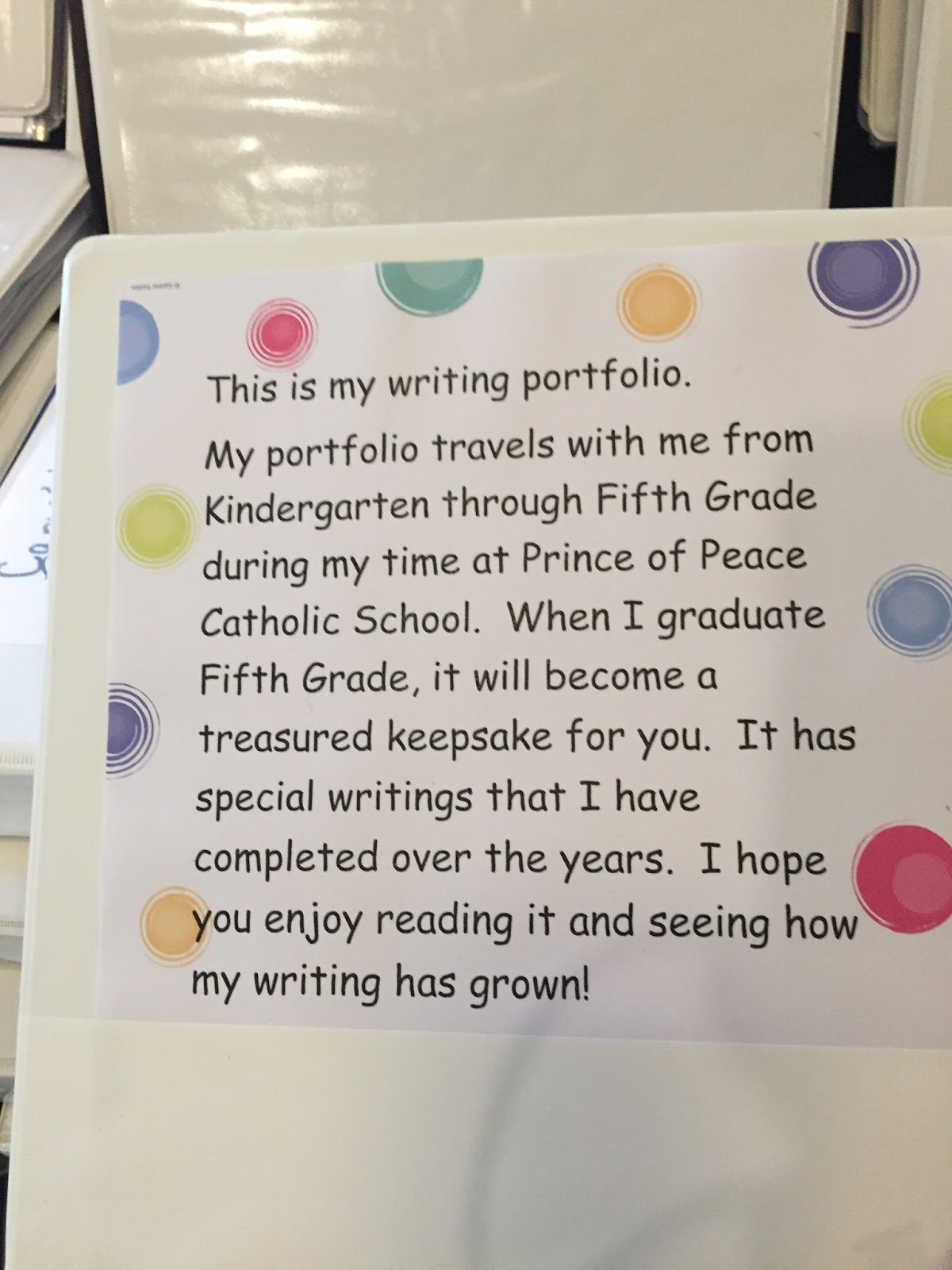 1. Starting in Kindergarten each child begins writing and collecting writing samples to create a writing portfolio. By 5th grade they have a fat stack of all sorts of writing! What a gift, what a record of a child's life!