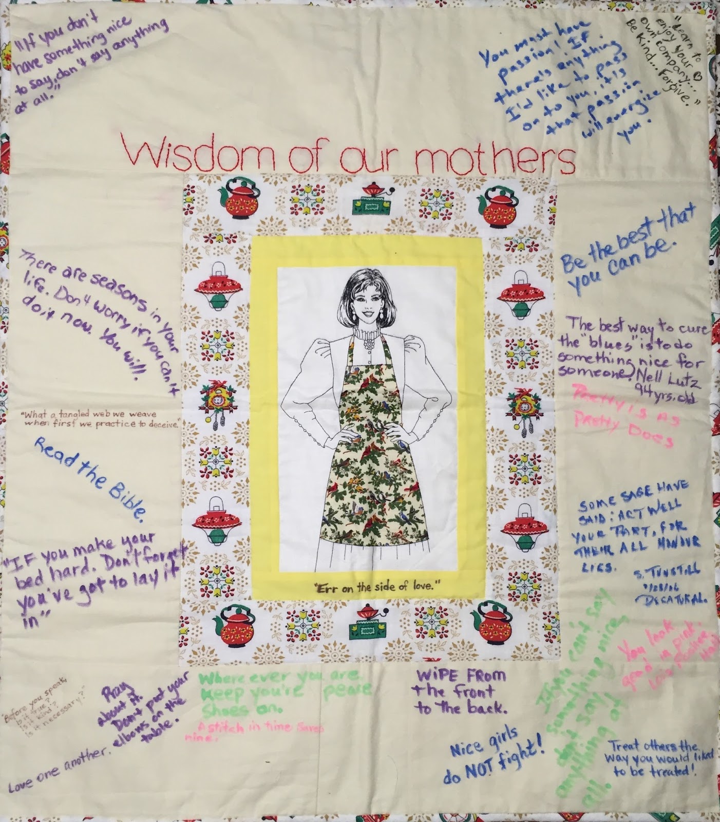 So, last year, when I spoke to Birmingham Quilters Guild, one of the amazing quilters Ann Griffin presented me with this quilt piece, with the instructions to take it with me on my travels and add bits of wisdom. Here's what it looks like right now: