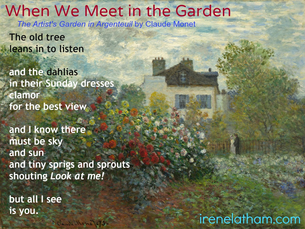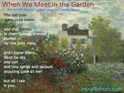 Today's poem is inspired by "The Artist's Garden in Argenteuil (A corner of the Garden with Dahlias)" by Claude Monet. At first glance the painting is all dahlias, but then there's that tiny couple hiding beneath that tree... so of course I had to make this a love poem! (How many of these poems have been love poems? Soon I will count them all up and let you know.)