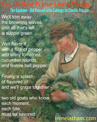 Today's poem is inspired a piece I adore -- "The Gardener- Old Peasant with Cabbage" by Camille Pissaro. The peasant reminds me of my grandfather, who loved his garden -- and my grandmother. Right away I knew I wanted this to be a love poem. I struggled a bit with the ending -- not sure I've got it quite right, but I do love the "we" in the poem and the picture I have in my head of these "old goats."