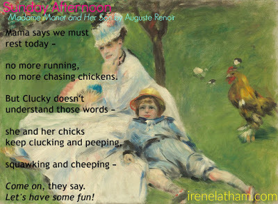 Today's poem is inspired by a Renoir pieced called "Madame Monet and Her Son." I was drawn to the expression on the boy's face... he doesn't look all that happy, does he? And then I spied the chickens, and I thought I might know why...