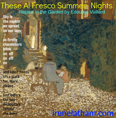 Today's poem is inspired by a magical (to me) piece "Repast in the Garden" by Edouard Vuillard. It's magical because I love dusk, love lighting the mosquito torches and taking our supper out to our back porch, which overlooks our woodsy, private backyard. We keep chair cushions and a little caddy of silver and napkins and salt-n-pepper and such right by the back door, always at the ready. Sometimes we talk, sometimes we laugh, sometimes we just listen to the world around us. I tried to put some of that magic into the poem.