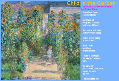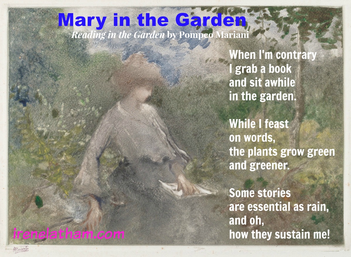 I selected today's piece because it's an image of how I'd like to be spending my time in the garden. :) As I was thinking about what to write I had this memory of the first day of fifth grade. My teacher Mr. Mac read my name during roll call -- Mary Dykes -- yes, I am one of those who is called by my middle name! This has caused all sorts of confusion over the years, and I don't recommend it. So Mr. Mac said, "are you Mary Had a Little Lamb" or "Mary Quite Contrary" ? I said, "I'm Irene." :) So, obviously, sometimes, a bit of real life creeps into these poems when I am least expecting it.