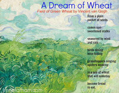 Today's poem is after a piece I adore. I've really enjoyed thinking about it: "Field of Green Wheat" by Vincent van Gogh. I ended up with another "dream" poem (last week was "A Dream of Sheep"). Isn't that interesting? I wanted to be sure and tuck some critters into this world of wheat... this is where I landed: