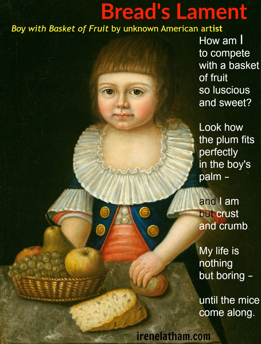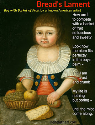 Today's image was the first image I found when I began rounding up images on this year's theme, so I've been thinking about this little boy for a couple of weeks now. Those eyes! But, again, I didn't know what the boy could say that would be unique/original. So I started looking at the other elements of the painting. I kept coming back to that hunk of bread...