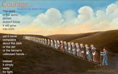 Today's poem is inspired by "Planting Corn" by Stanley Mazur. This poem went in an entirely different direction than I was expecting. What drew me to the painting was the row of women, and the farmer in charge. Yes, I could make this a feminist poem, but mostly I was drawn to the mathematics of planting and started out writing about the way the farmer measures the field like a seamstress. But then I read the April 5 (I write these poems a day ahead during National Poetry Month so I can post in a timely manner) reading in The Book of Awakening by Mark Nepo, which, in a wonderful bit of serendipity, spoke of the courage of the seed. And then that's all I could think about! So often I am inspired by what I am reading... which is a good reminder to read wide and often. (I can always go back and write the feminist and mathematics poems later.)