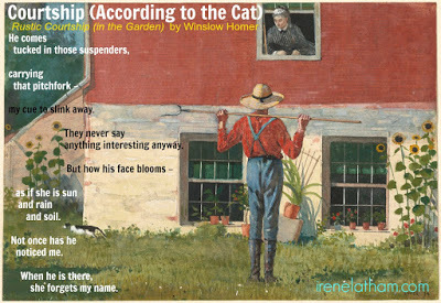 Today's poem is another love poem... and it's kind of fitting, as today marks 26 years since me and Paul's first date. It was a blind date, actually, and a whirlwind courtship followed... we married almost exactly a year later. So when I saw "Rustic Courtship (in the Garden)" by Winslow Homer, I knew it was the piece I wanted to write about. But courtship poems have been done and done and done... how could I bring an element of surprise to this subject? Change perspective, of course! Read on...